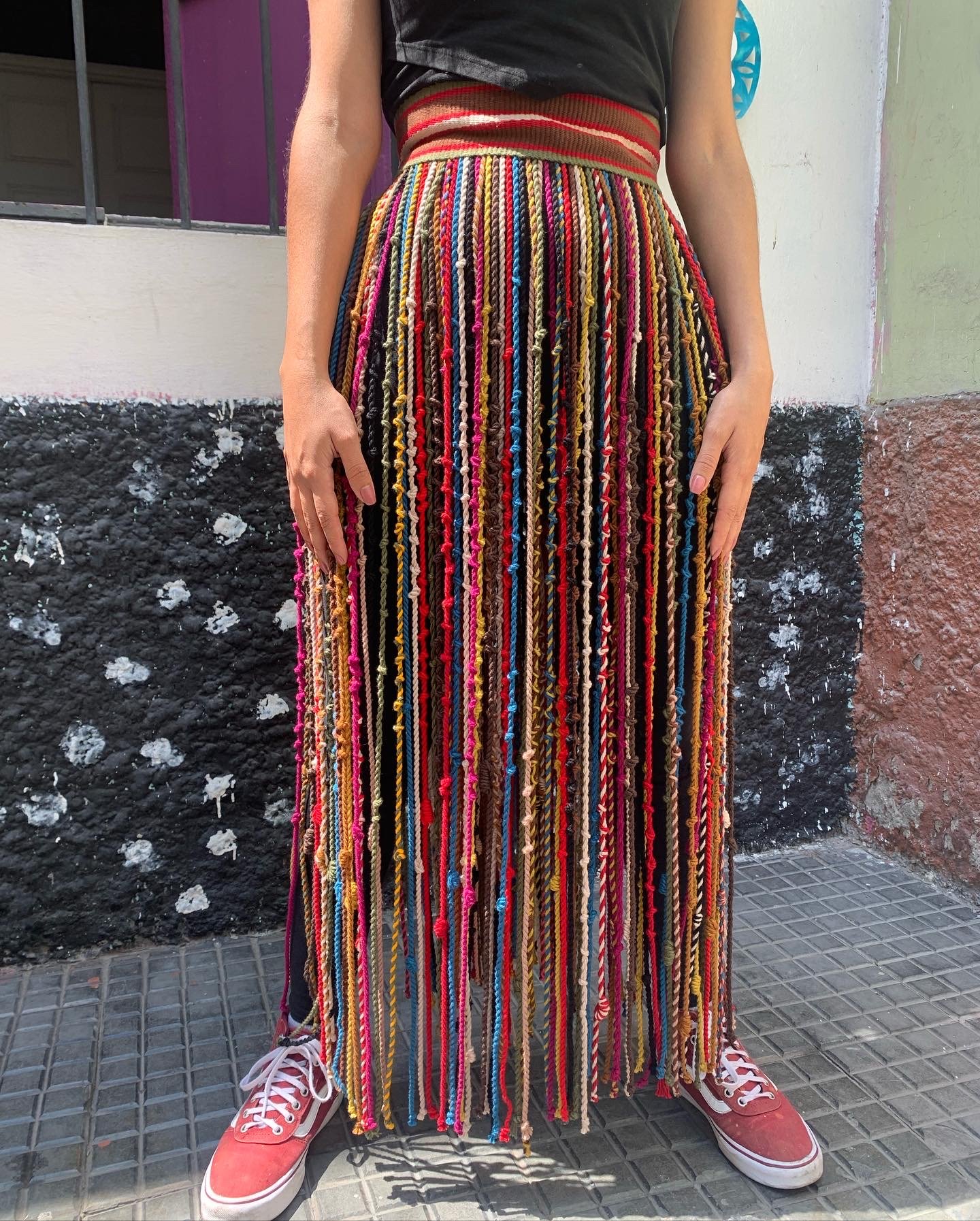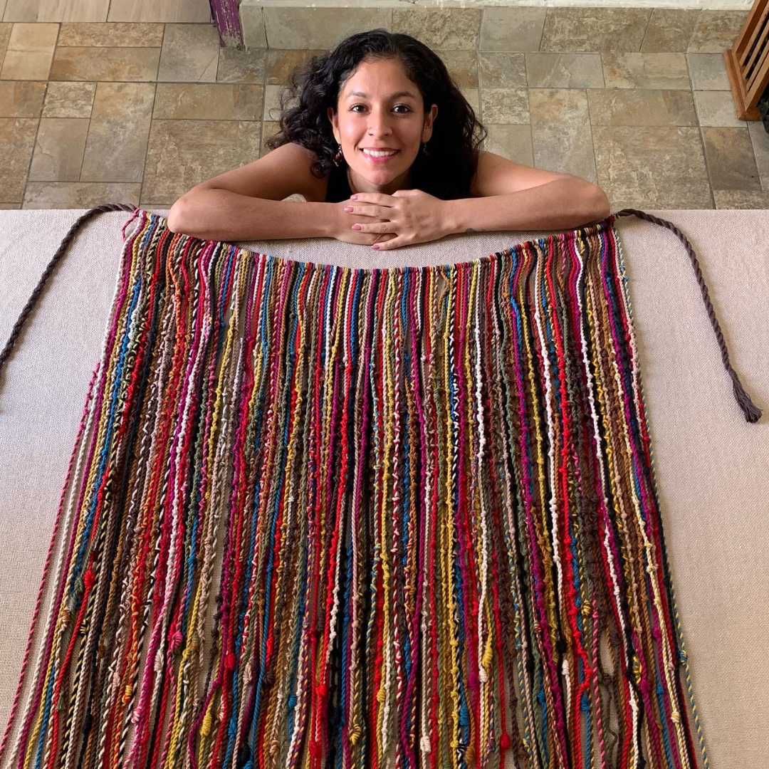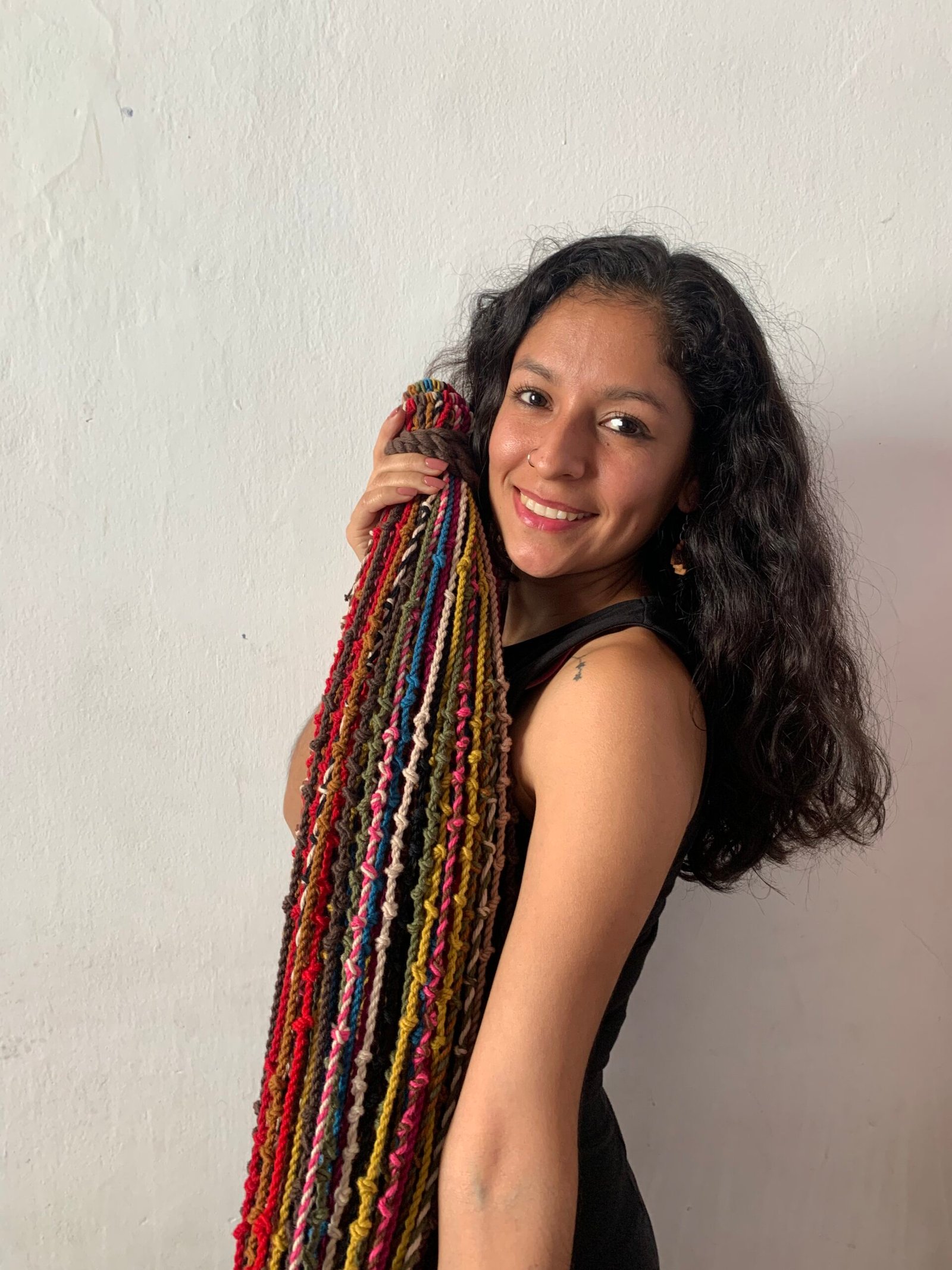 La Falda Quipu es una pieza textil contemporánea inspirada en el milenario sistema de registro andino conocido como quipu. Fue elaborada especialmente para la cantante Aracely Poma quien la ideo para que forme parte de su vestuario escénico.En esta creación, las cuerdas que conforman la falda llevan anudadas fechas que evocan a mujeres importantes en la vida de la artista, convirtiendo la prenda en un tejido cargado de memoria y significado. El diseño se complementa con un cinturón tejido en la técnica de faz de urdimbre, que sostiene y enmarca la estructura de cuerdas.