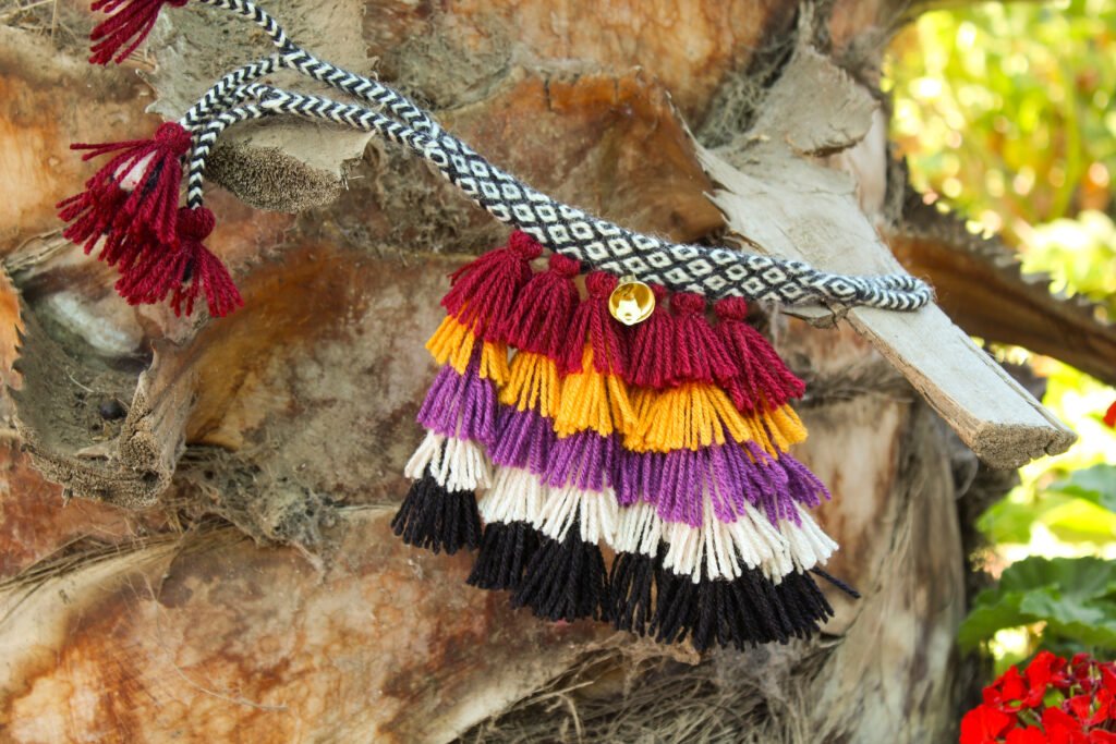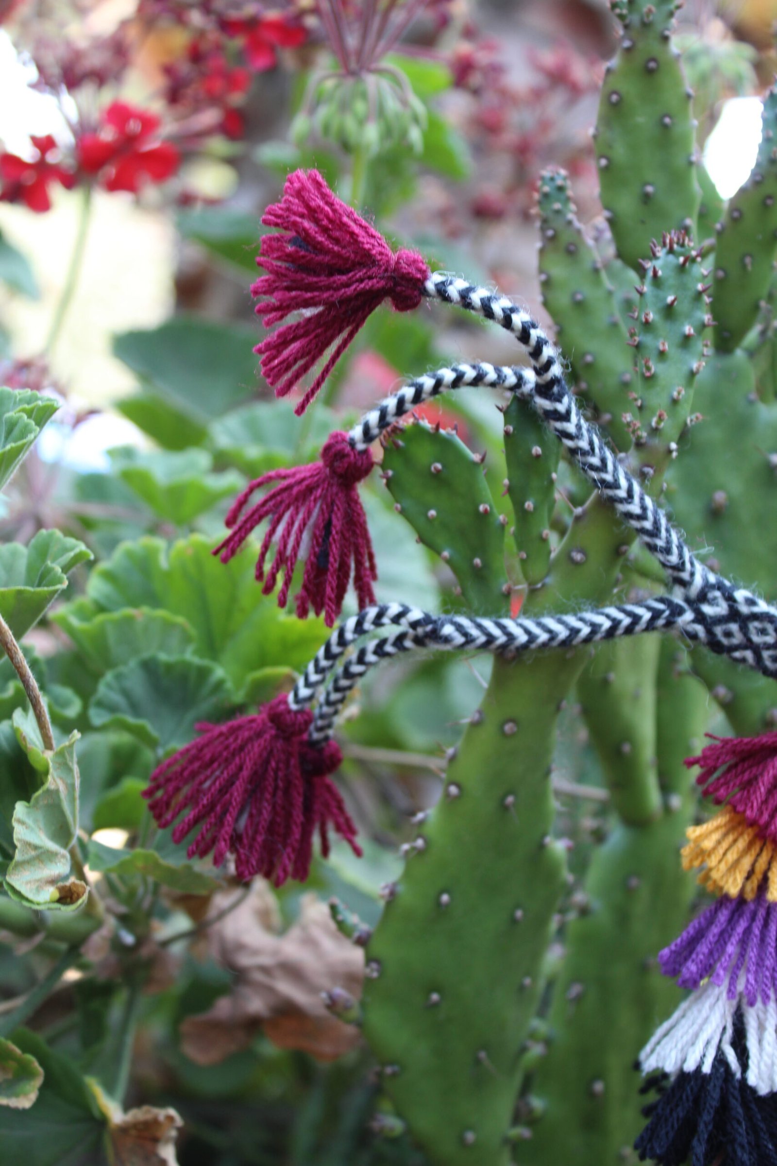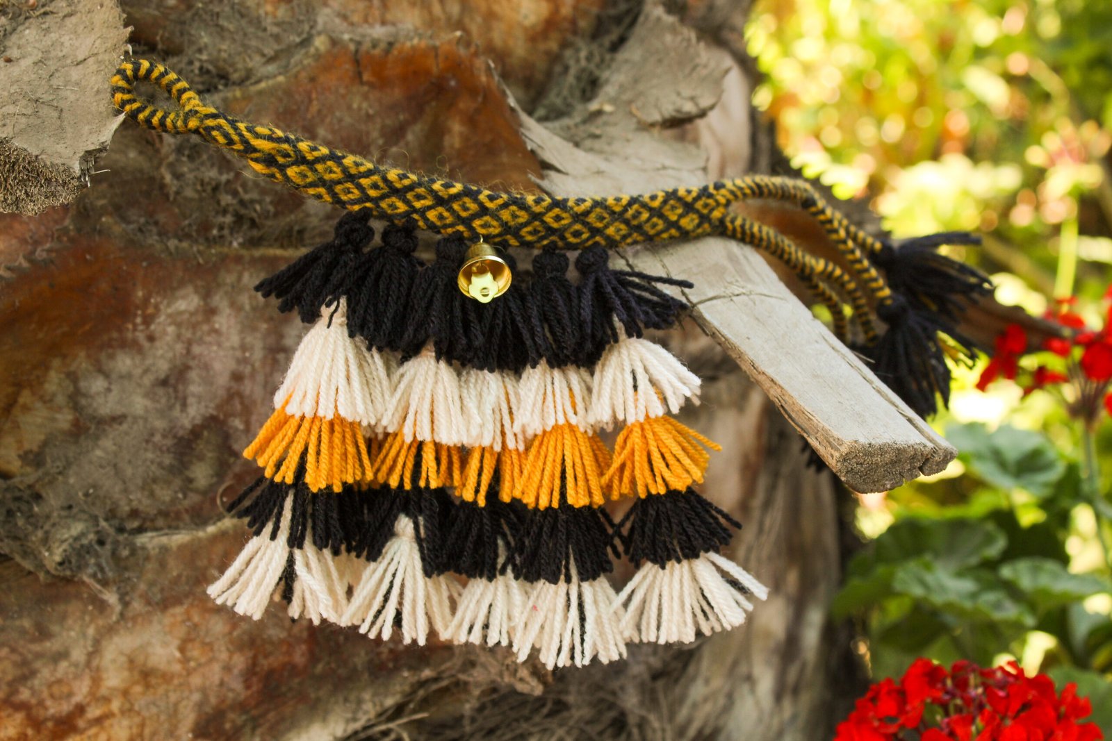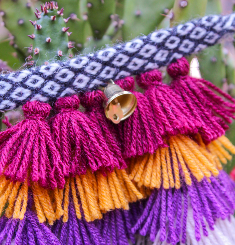 La corona de llamas es un adorno textil tradicional utilizado para embellecer a los camélidos en las caravanas, una práctica que fue esencial para el transporte y el intercambio en tiempos precolombinos y que aún perdura en algunas comunidades andinas.Esta pieza es una réplica elaborada con la técnica de trenzado en cruz, decorada con borlas y pompones que aportan color y movimiento. Más allá de su función ornamental, la corona simboliza el valor y el respeto hacia los animales que sostienen la vida en las alturas andinas, así como la profunda conexión entre las personas y su entorno natural.