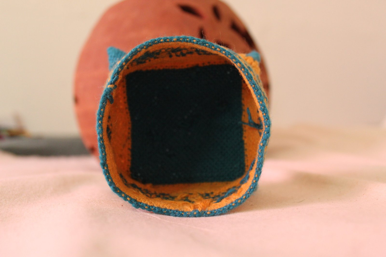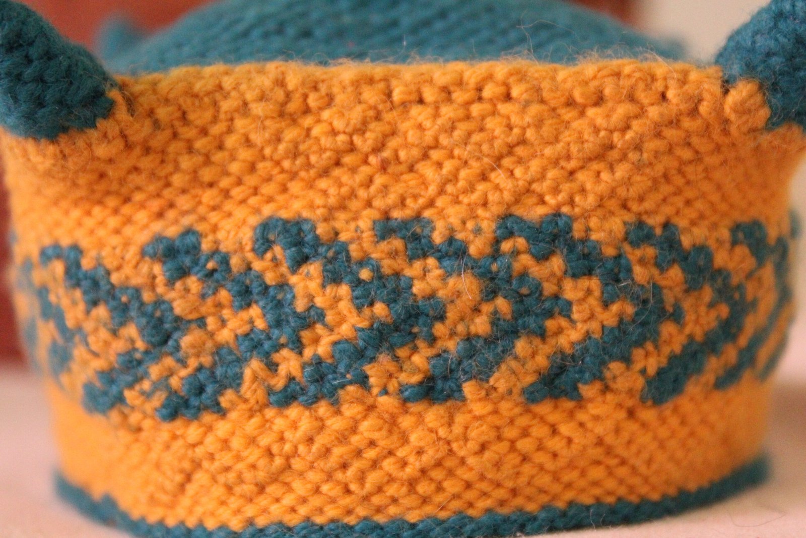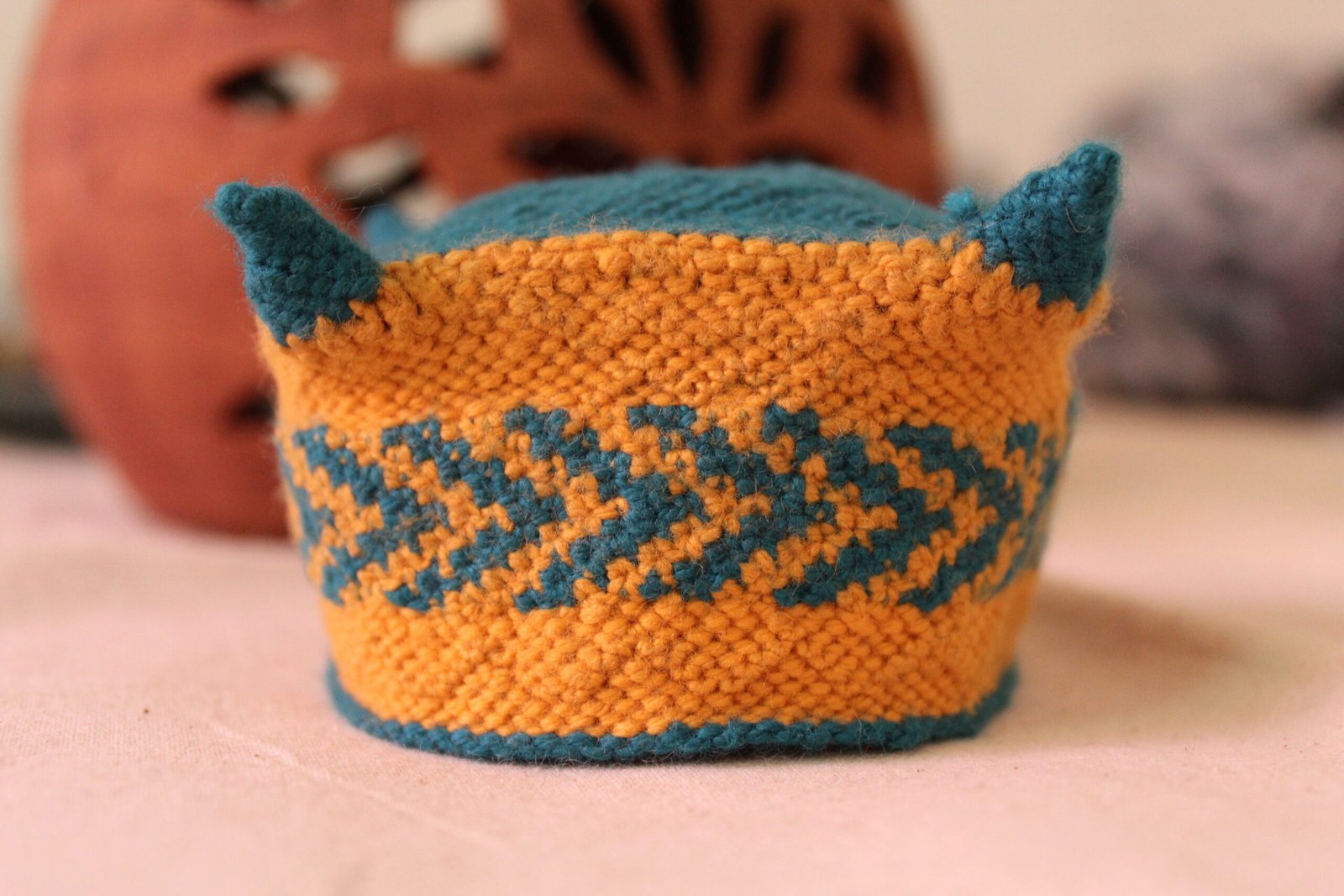 El gorro de cuatro puntas es una pieza emblemática de las culturas precolombinas Wari y Tiahuanaco, donde tuvo un profundo significado social y simbólico. Su diseño, compuesto por cuatro prolongaciones en las esquinas, no solo cumplía una función estética, sino que también comunicaba identidad y estatus dentro de la comunidad.Esta obra fue elaborada en un taller dirigido por la maestra Isabel Martínez, aplicando la técnica de anillado compuesto para construir tanto la estructura como los diseños que lo ornamentan. La minuciosidad en su ejecución rinde homenaje a la complejidad y refinamiento de la tradición textil andina, preservando un legado que ha perdurado por siglos.
