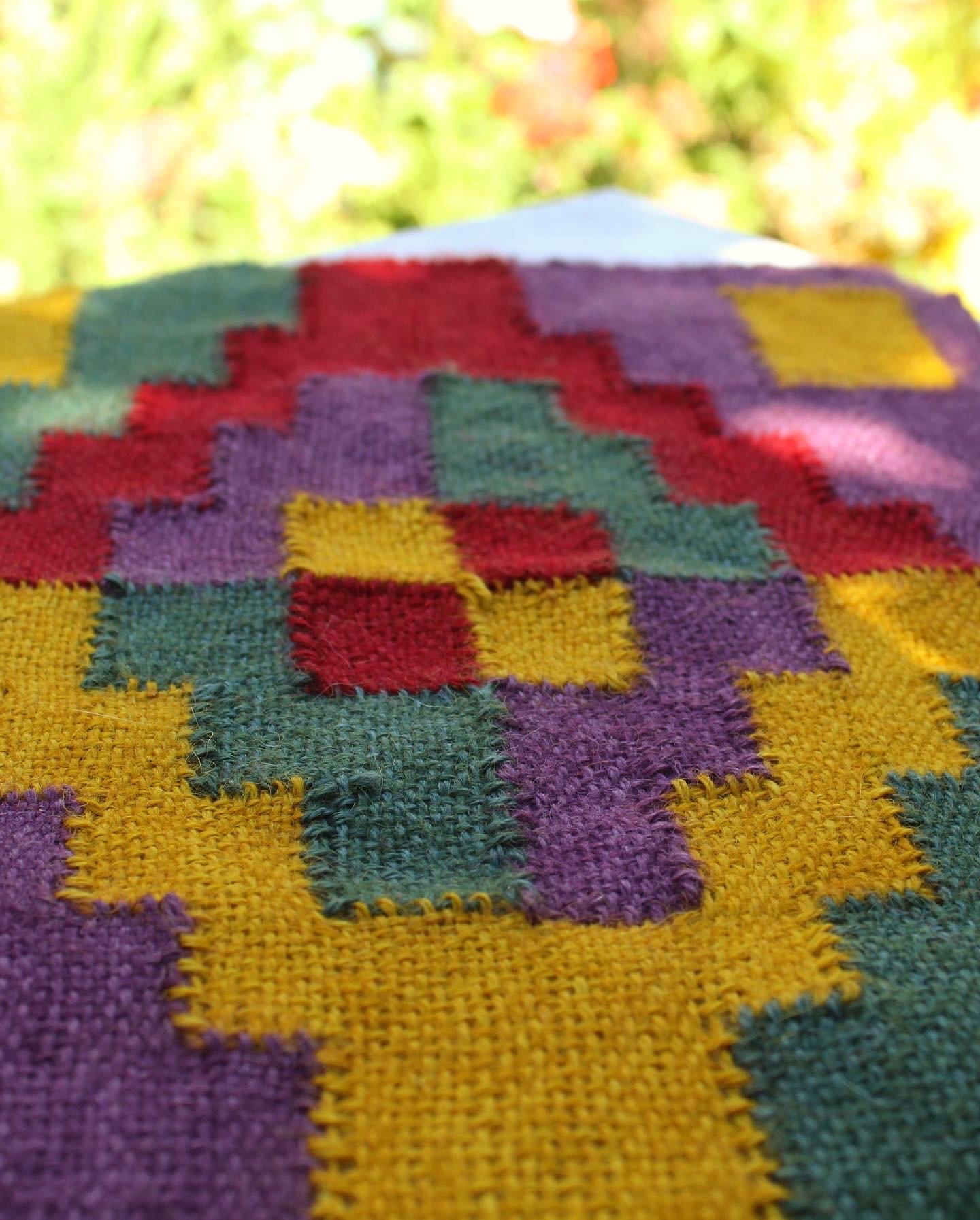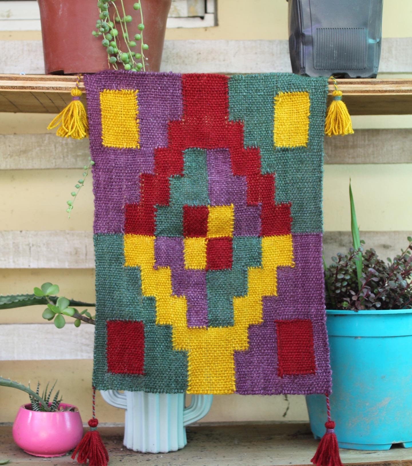 Esta pieza representa la Chakana o cruz andina, símbolo fundamental en la cosmovisión de los Andes. Fue elaborada aplicando la técnica de urdimbres y tramas discontinuas, una de las tradiciones textiles más relevantes y sofisticadas de las culturas precolombinas. La obra fue desarrollada durante las clases en la institución Arte Textil Pawllu, bajo la guía de la maestra María Victoria Carvajal.